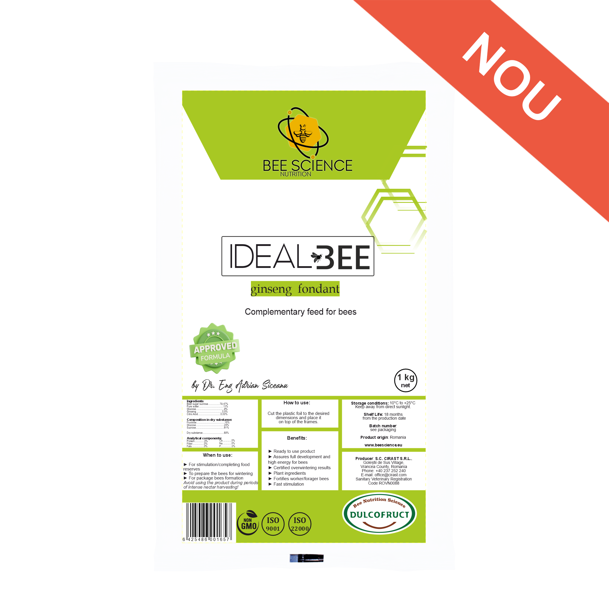 Fondantul este realizat din micro-cristale acoperite cu un strat de sirop de glucoză, care previne formarea crustei cristalelor. Beneficii: Gata de utilizare și ușor asimilabil Asigură dezvoltarea completă a coloniilor de albine prin absorbție rapidă și nutriție eficientă. Înlocuitor temporar în situații de criză Poate substitui până la 100% din hrana cu carbohidrați în situații de urgență pe termen scurt. Îmbunătățește imunitatea și eficiența la cules Ginsengul stimulează sistemul imunitar, crescând vitalitatea și performanța albinelor la cules. Crește rezistența și durata de viață a albinelor In condiții experimentale a crescut semnificativ longevitatea albinelor captive, comparativ cu albinele care au primit hrană fără ginseng. Ambalare: 10 buc/cutie Condiții de păstrare: 10°C și +25°C. A se păstra departe de lumina directă a soarelui. Evitați utilizarea produsului în perioadele de cules intens de nectar! Perioada de valabilitate: 18 luni. |